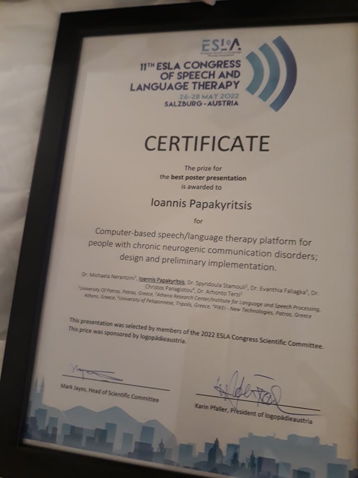 Nerantzini, M., Papakyritsis, I., Stamouli, S., Faliagka, E., Panagiotou, Ch., & Terzi, A. computer-based speech/language therapy platform for people with chronic neurogenic communication disorders: design and preliminary implementation. 11th European Congress of Speech and Language Therapy, (ESLA), Salzburg, 26-28 May 2022. Awarded the prize for the Best Poster Presentation.